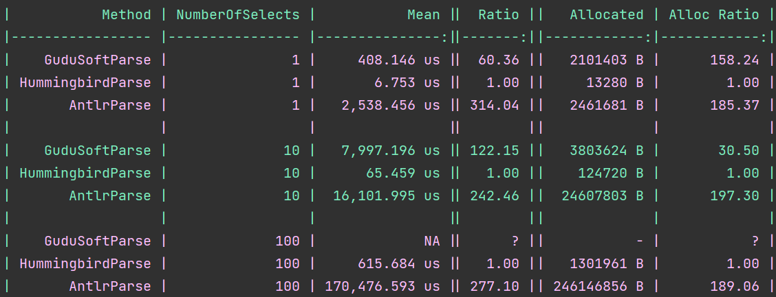 We are 60x faster than Gudu for a single select and 314x faster than ANTLR. Good! For 10 selects, we are 122x faster than Gudu and 242x faster than ANTLR. In the end, for 100 selects Gudu errors out, and we are 277x faster than ANTLR.