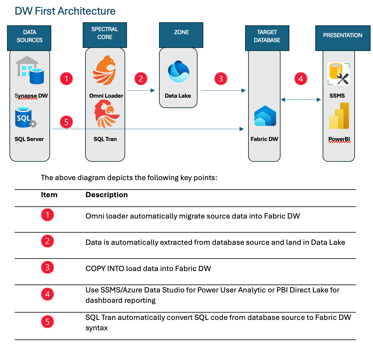 This article focuses on our migration accelerator tools, Omni Loader and SQL Tran. These tools allow Synapse Dedicated Pool and SQL Server customers to easily migrate schema (DDL), database code (DML), and data to Fabric Data Warehouse. We will also discuss the Fabric DW First architecture as the reference architecture in this article.